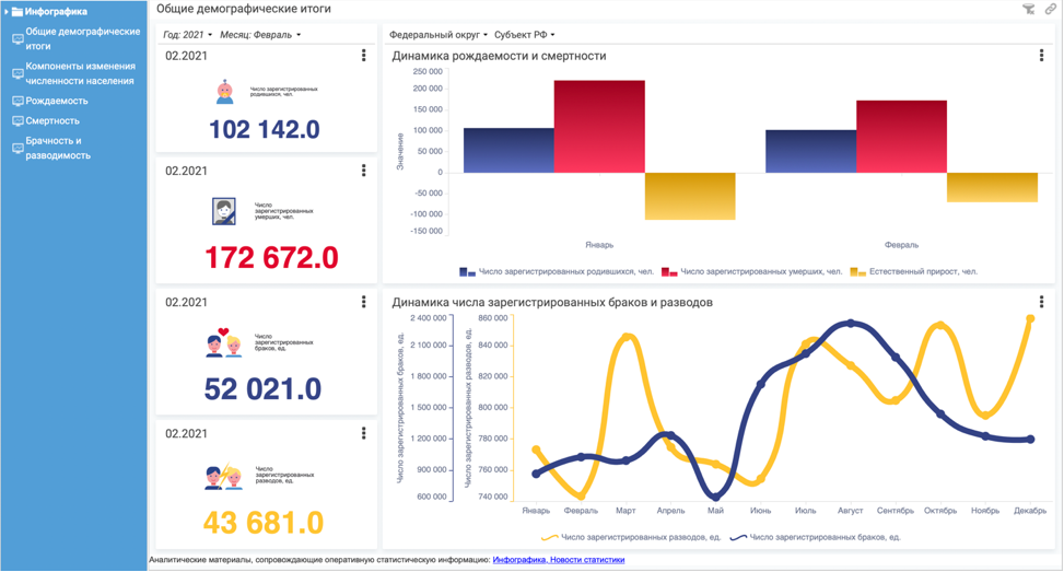 В настоящее время Росстат, как и все национальные статистические институты мира публикует статистические данные в форме Excel таблиц, PDF файлов, статических HTML страниц. Развитие информационных технологий, навыков пользователей статистики требует перехода к новым способам публикации – интерактивных информационным панелям, объединяющим многомерные вычисления на основе OLAP-технологий, высокую интерактивность и богатую визуализацию данных.